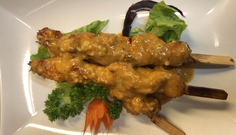 - Charcoal grilled chicken stays with nut sauce, incl. soya