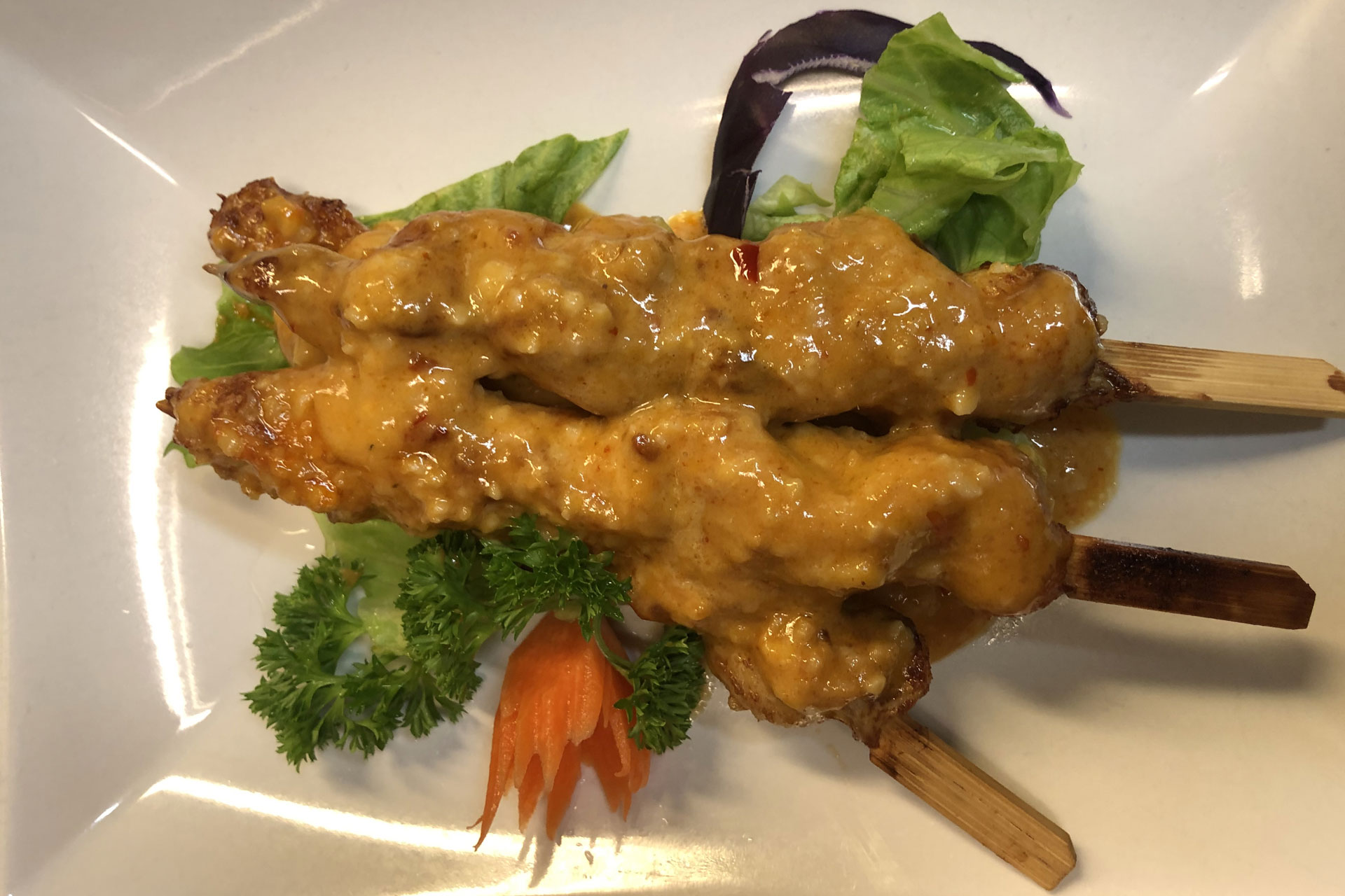 - Charcoal grilled chicken stays with nut sauce, incl. soya
